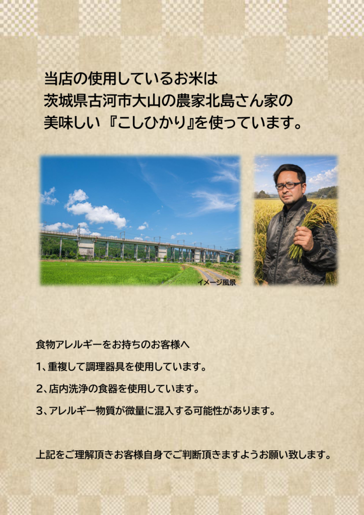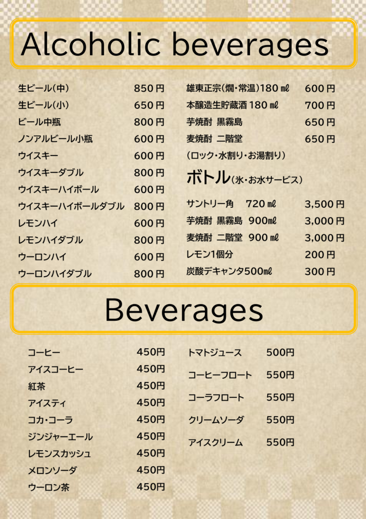 | お飲物のみ | お一人様につき、お飲物一品以上のご注文をメニューよりお願い申し上げます |
