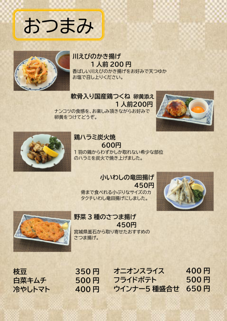 | 2,000円 | 1,000コースのお料理・ロールサンド・ポテトチップス ソフトドリンク付き 組ごとにペットボトル1本(コーラ又はウーロン茶) |